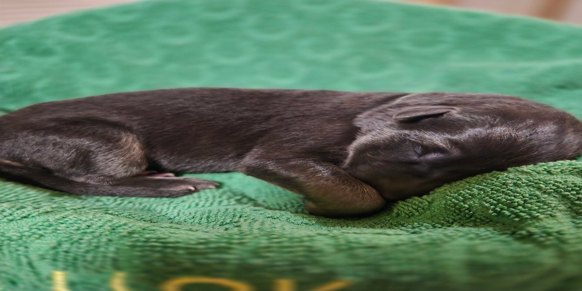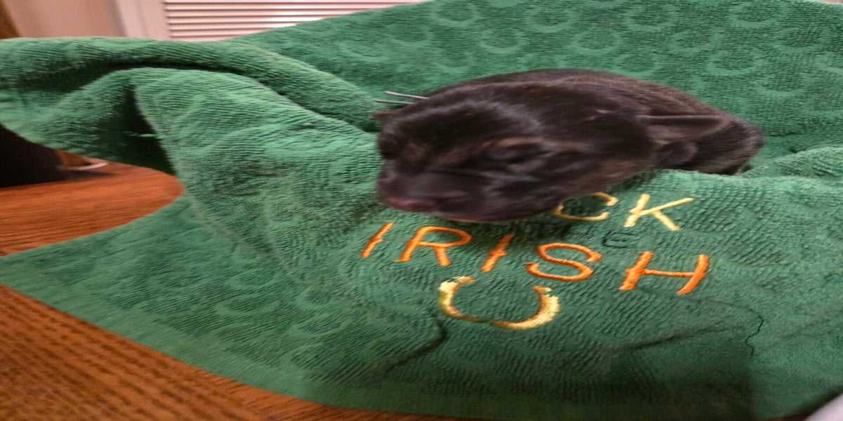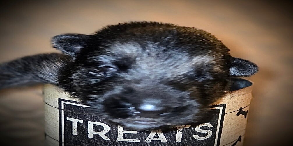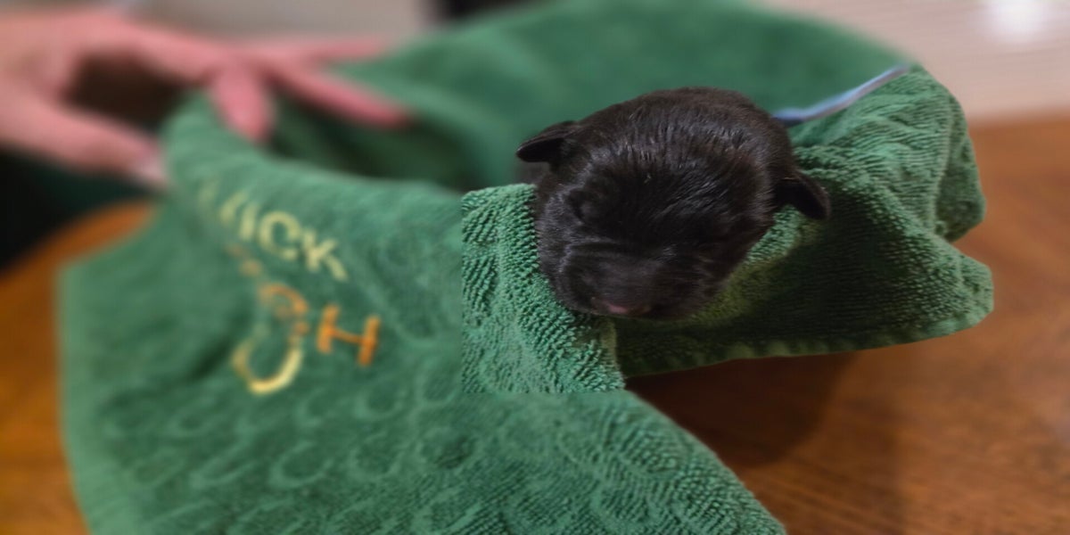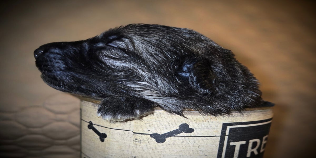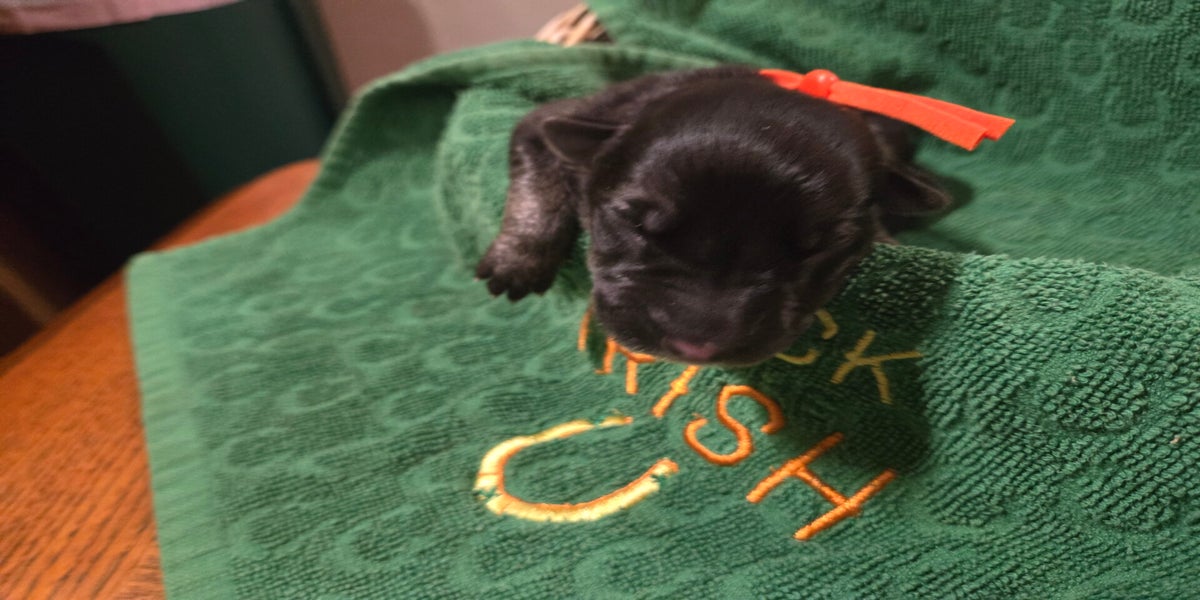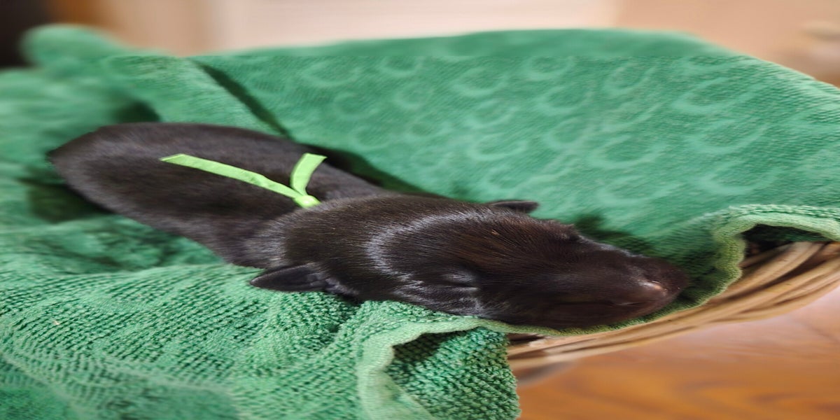 These lucky pups were born March 12th. All 14 and thriving!! Beautiful colors coming out bit by bit some solid blacks 7 girls and 7 boys.